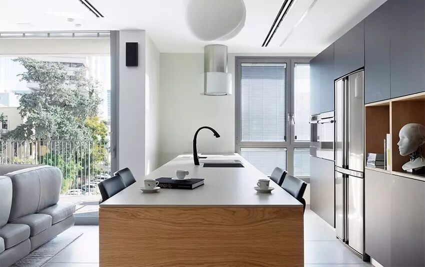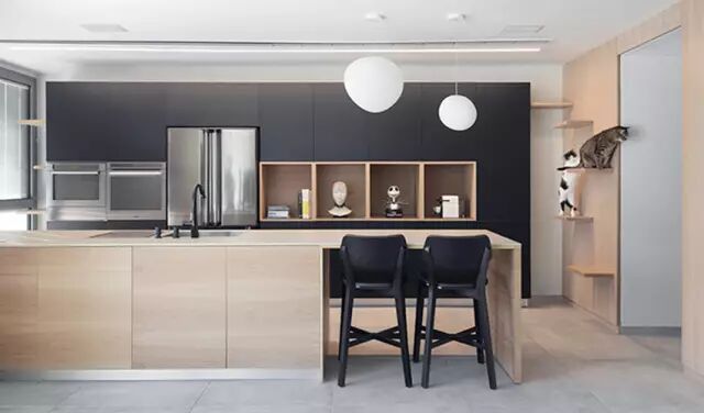除了生活杂物需要隐藏摆放外,如果你也是猫咪爱好者,请来参考这件猫咪公寓,结合餐厅与厨房区域,纳入深色木作柜并加上原木色系跳台,满足屋主料理时,也能一边与爱猫互动的需求。而卧房与阳台之间,运用开放式客厅与厨房空间串连,让生活动线更宽敞,卧房内也能清晰的享有阳台外的辽阔视野。色彩上则以黑白灰基调融入木质设计呈现沉稳简约知性风格,通过足够的室内采光营造出轻盈舒适的辽阔感。
