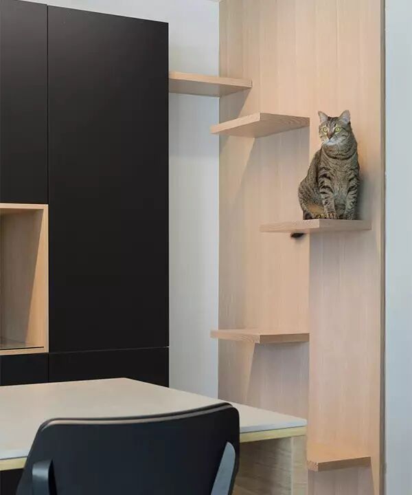 充分运空间面配置,从厨房墙面到书房,规划为猫咪的生活区域,加入收纳需求之余利用木板成为跳台,保有屋主与宠物间各自生活隐私,再经过色调搭配,让猫咪跳板与屋内设计融合,兼具美观与实用成为画龙点睛的时尚效果,满足不同功能需求。