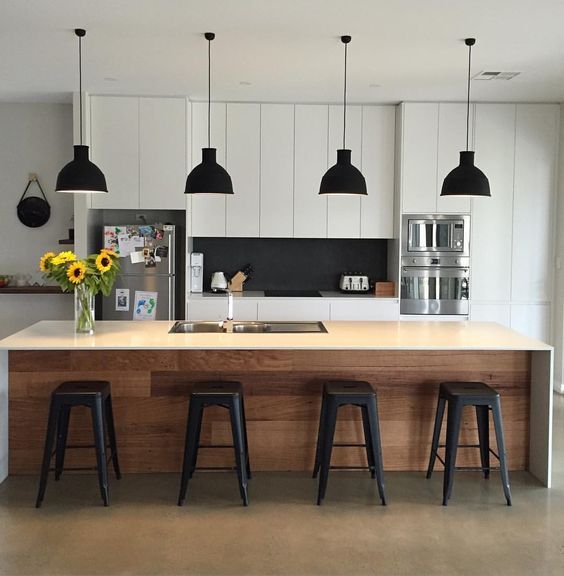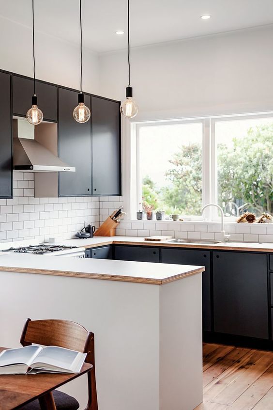 ▲ 现代化的黑色和白色厨房搭配木制的厨岛