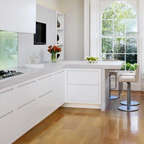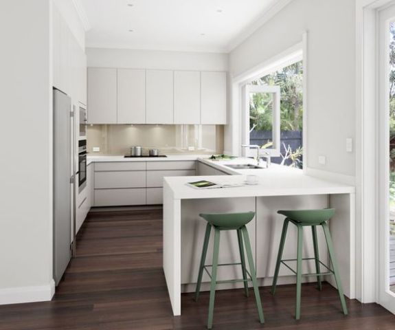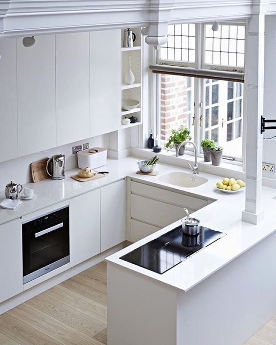 ▲ 小的U形白色厨房带有早餐空间和烹饪区