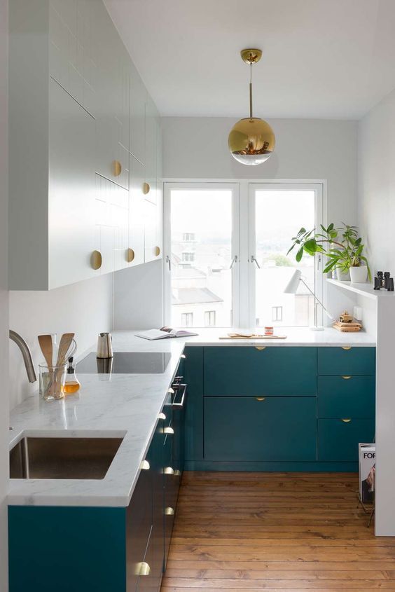 ▲ 大胆的白色和木制的L形厨房,配有深青色以及书架,以分隔空间