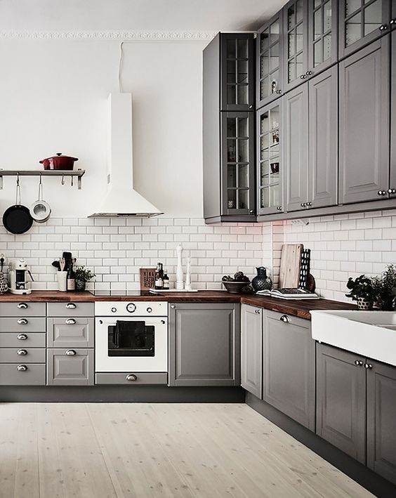 ▲ 复古的灰色L形厨房,大型开放布局,看起来更宽敞的原因是没有分隔