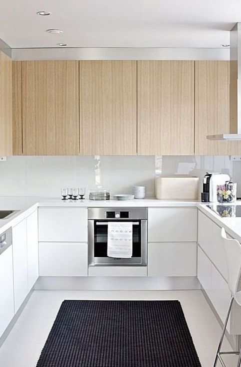 ▲ 使U形厨房更加迷人的浅色悬挂柜和白色柜体