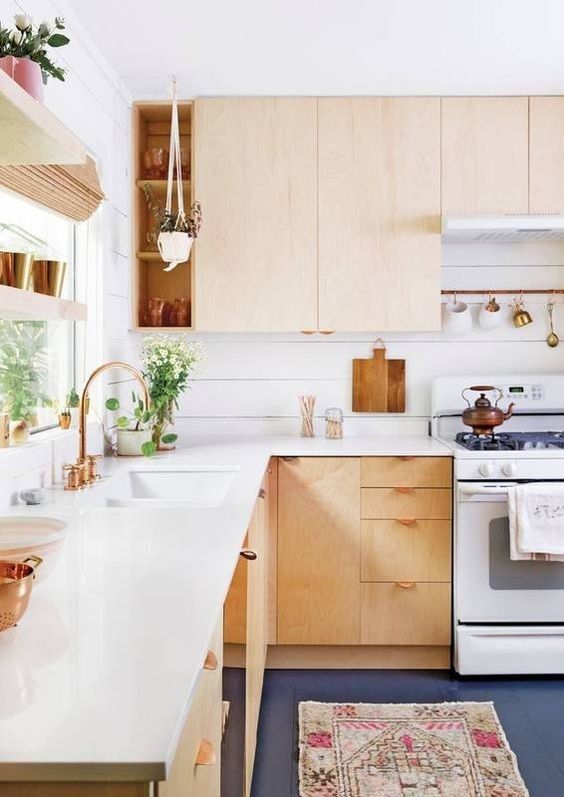 ▲ 浅色木制L形厨房,铜色细节看起来温暖,非常温馨