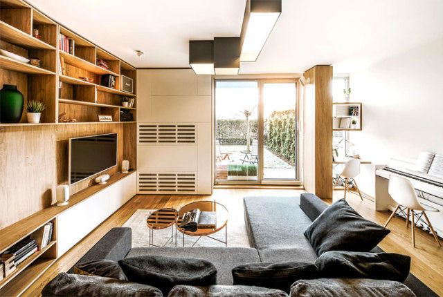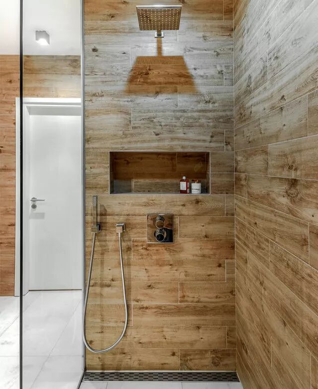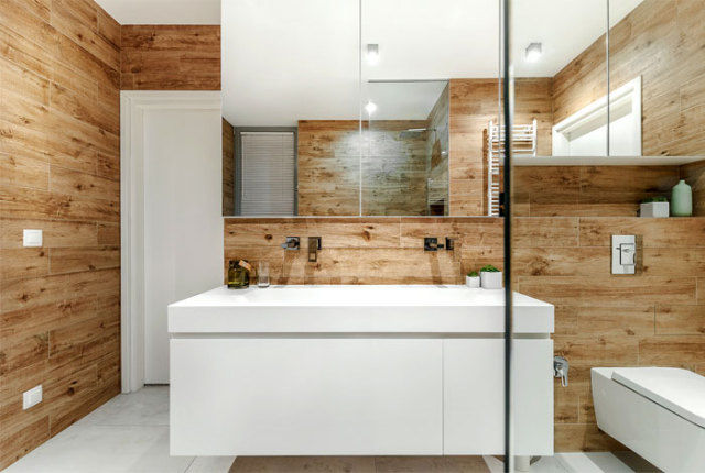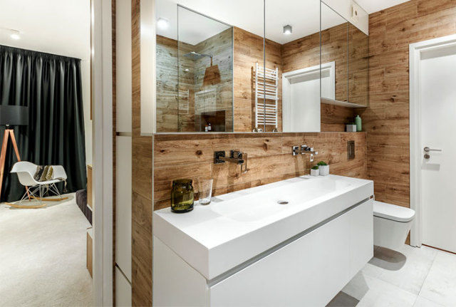 即使在浴室里,瓷砖与材料的连续性也让人联想到其余装饰的木质包层。在整个家庭中,现代设计的家具(时尚的颜色,材料和形状)与时尚的布置和照明解决方案相结合。