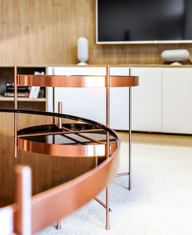材料,纹理和颜色的组合是动态的,旨在实现平衡而舒适的环境。硬木的温暖与新鲜的白色细节与发光的自然光相融合,为大型,暗色而时尚的软家具布置以及铜装饰创造出平衡的场景。