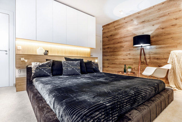 在三层 - 主卧室与巨大的露台为临,设计师再次使用木质包层的温暖,不同的是这一次是与天鹅绒纹理和暗色调相结合。