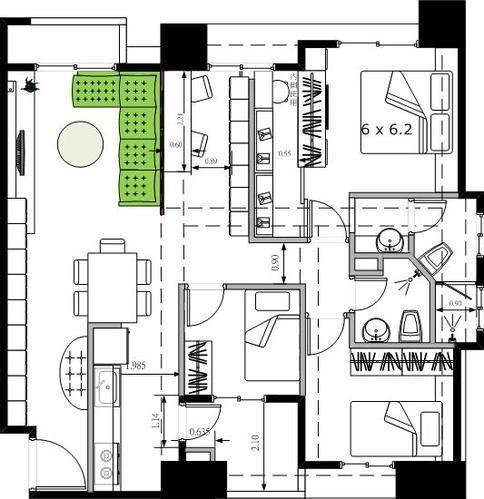 3. 维持 1+2 : 主卧 + 2 间卧室 的格局。