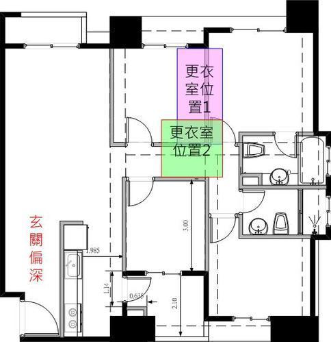 2. 更衣室的位置有两个选择 :(1) 的位置还ok; (2) 就不太好,这样会吃到右下角的进入空间,需要牺牲中间下方的房间.. 不好。