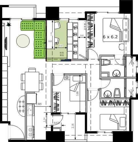 1. 书房改到中下房间(厨房旁)。将厨房的冰箱, 摆到对面去。外面的玄关自然变短,可以摆下170x85cm的餐桌。