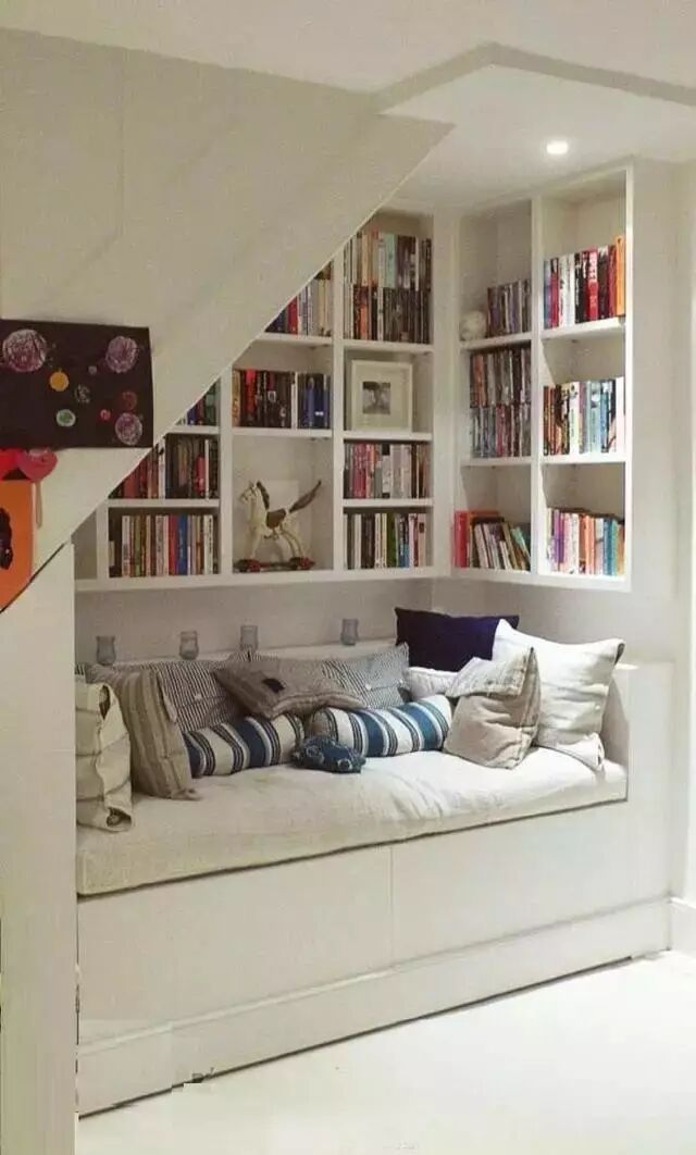 如果你的房间有一个小角落,可以利用这个地方在墙壁上安装折叠桌用于用餐——这个是一般人都能想到的。但你还可以给这个空间做个地台,让整个用餐的地方垫高二十公分,然后地台装上隐形抽屉就可以收纳很多物品了。