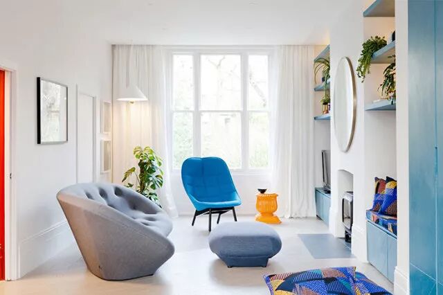 室内以白色的墙壁作为画板,利用各种鲜艳的颜色(蓝色、橙色、黄色等)进行创作,以几何及黄铜等要素进行室内风格渲染,最终成就了室内简约又活泼的整体环境。
