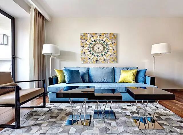 地毯和家具两者进行对比也是个好办法,比如室内色调以浅色为主,抱枕、窗帘、地毯的颜色接近,而沙发和桌子则颜色较沉重,这样对比层次感强烈。再通过艺术壁画、特色吊灯等装饰品,提升整个空间的艺术品味。