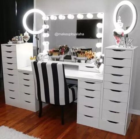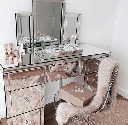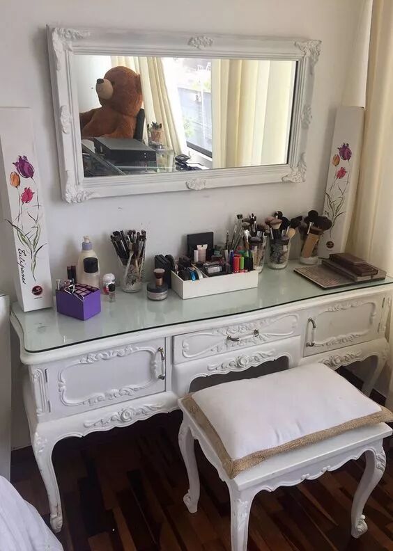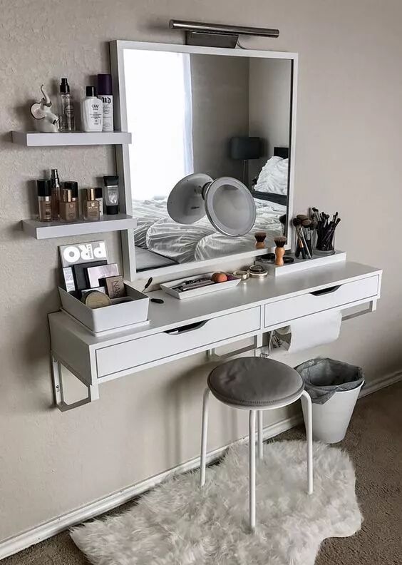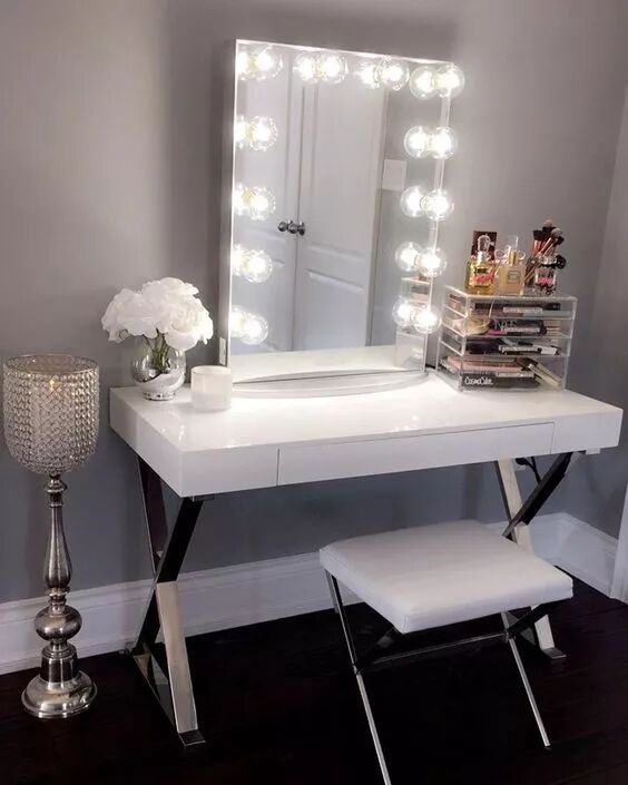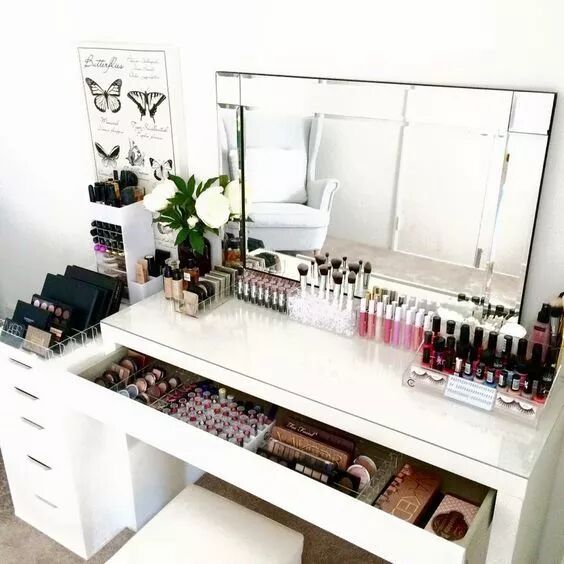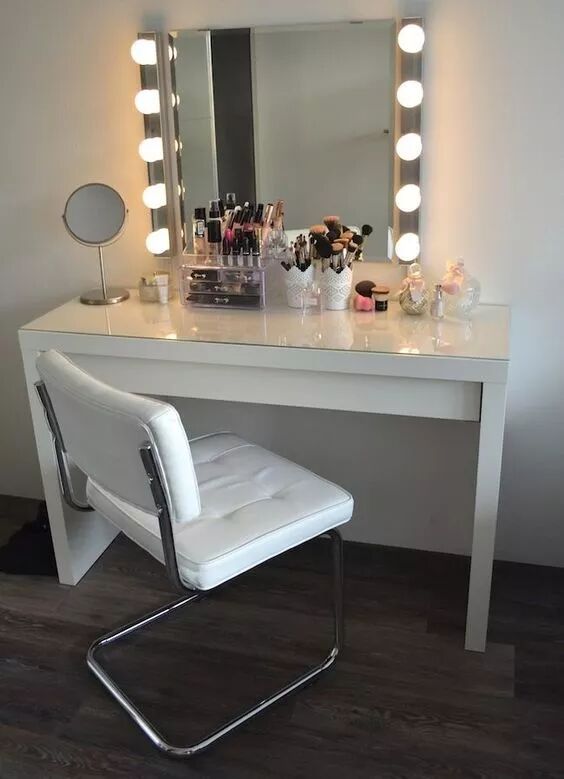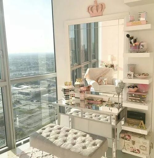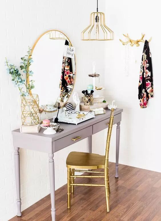 你的梳妆台是你美丽角落的主要构成,根据你的空间风格和颜色选择它。如果你有足够的空间,可以选择一个你喜欢的化妆台 - 它可以是老式的办公桌,变成一个梳妆台,一个大的光滑的白色台面与玻璃顶 - 这样的解决方案很棒,如果你在桌面上洒了东西,你可以很轻松地清理掉。大多数化妆台(或桌子)都有抽屉,对于收纳来说非常棒。如果空间很小,可以考虑一个小桌子甚至是壁挂款,即使是狭窄的架子也行。也许坐在那里不舒服,但即使是一个架子也足够化妆。