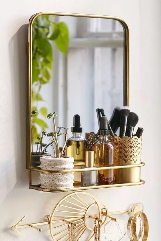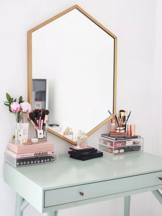 镜子是美容角的另一个主要的组成部分,它可以是不同的 - 根据你的梳妆桌和空间风格来选择。你可以选择一款简单的现代镜子,把它放在桌子上,或者两侧带有灯光的镜子,这非常舒适。几何,复古,魅力,工业 - 有很多镜子可供选择!如果你的桌面不够大,最好把镜子挂在墙上。
