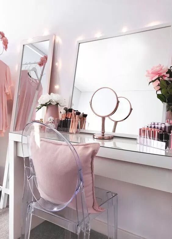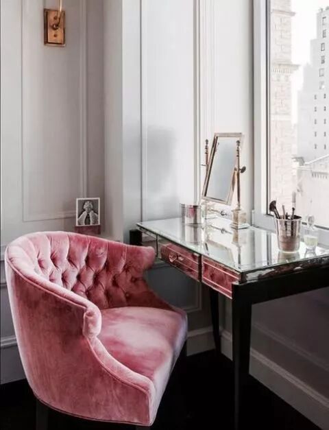 ▲ 带有镜子的化妆台和粉红色的天鹅绒椅子使这个化妆角非常华丽和可爱
