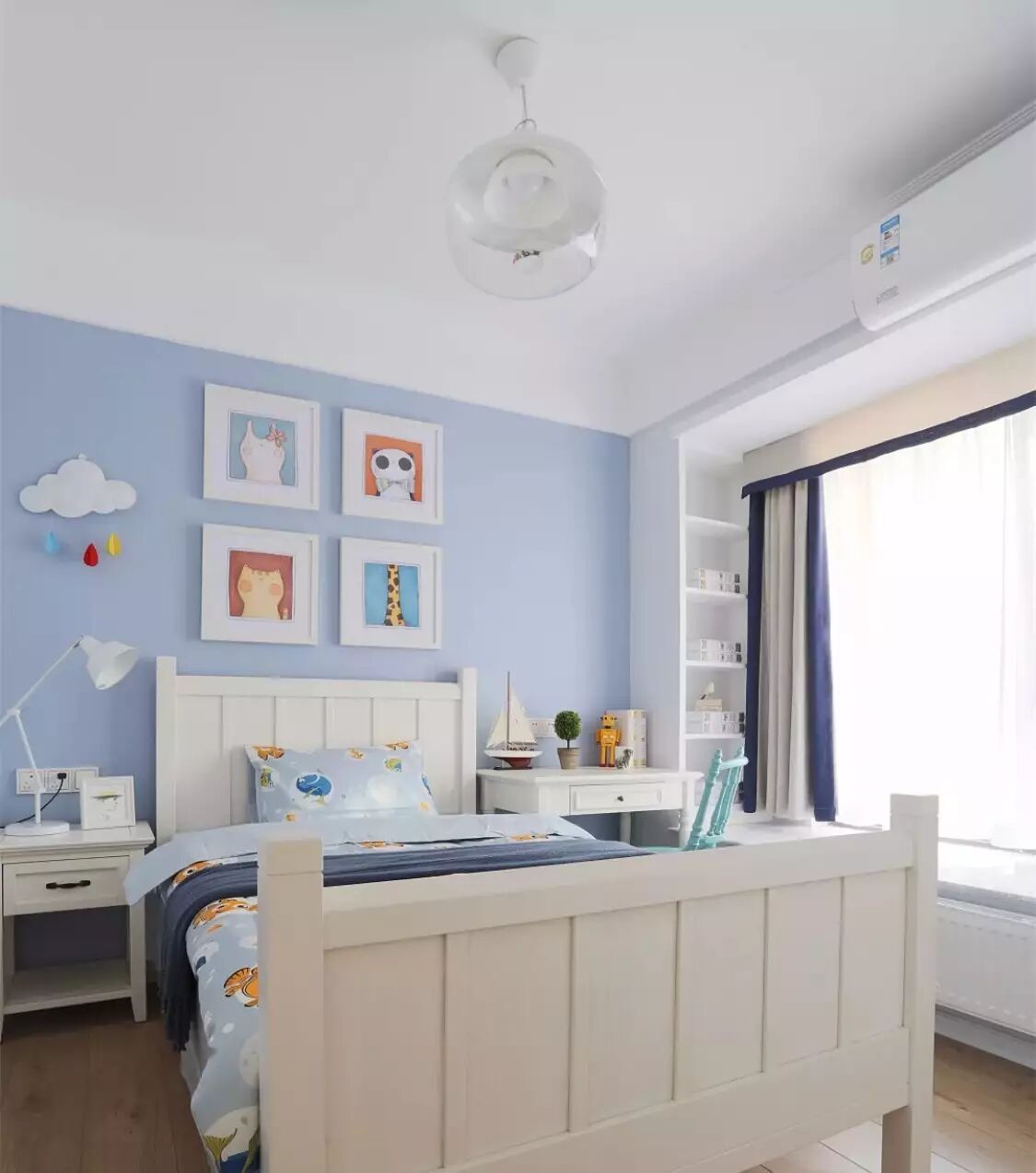 蓝色是一种比较安静清新的色调,可以搭配出一种独特的浪漫气息。一般这种颜色是用在儿童房比较多,同样这种颜色用在主人房等卧室空间里,效果也是相当不错的,氛围很祥和舒适。