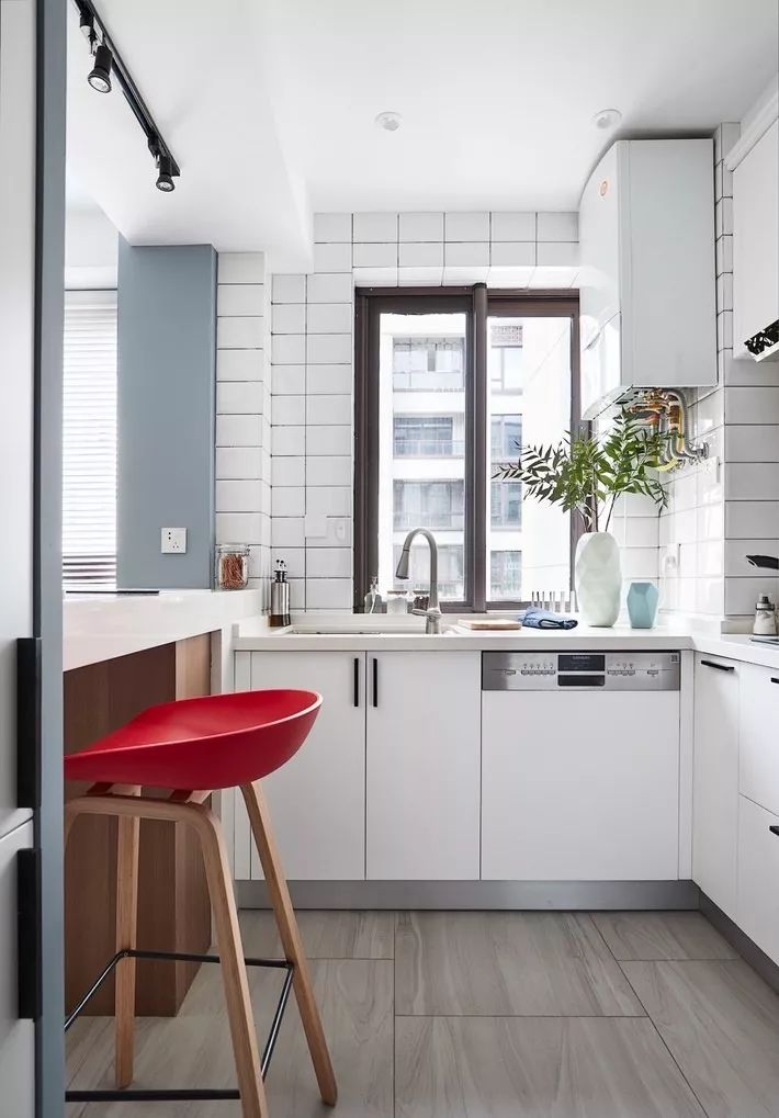 厨房的墙面一般比较单调,实用性远远胜过了装饰性,因而没有太大的亮点。如果用花砖进行装饰,和其他单色砖形成一个视觉上的对比,或许就能轻松打造视觉焦点了。