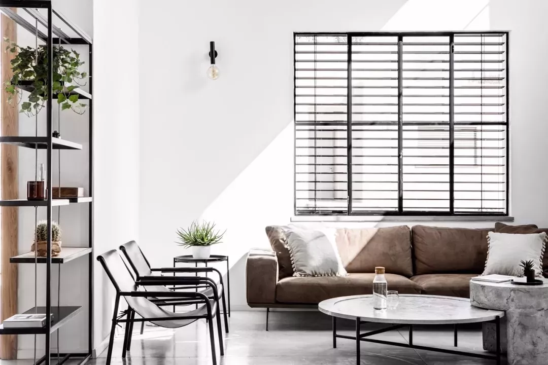 加入木质元素,调和铁件的冰冷感,在只有单面采光条件下,公共空间采用开放式规划,书房透光玻璃作为与客厅之间的隔间,让光线增加全屋明亮度。