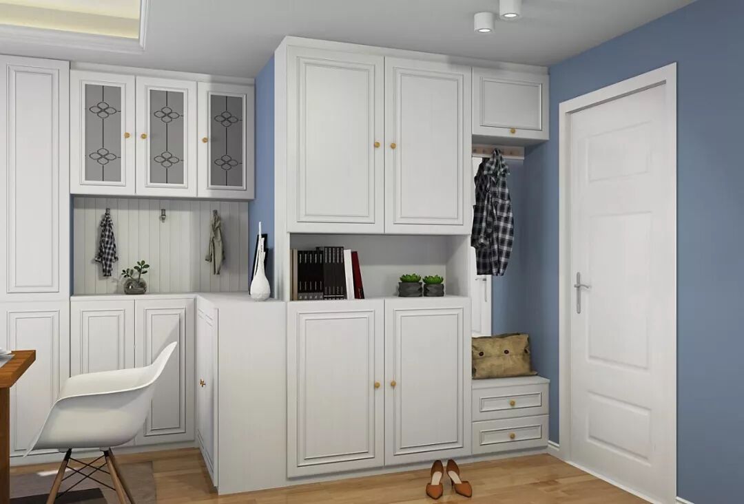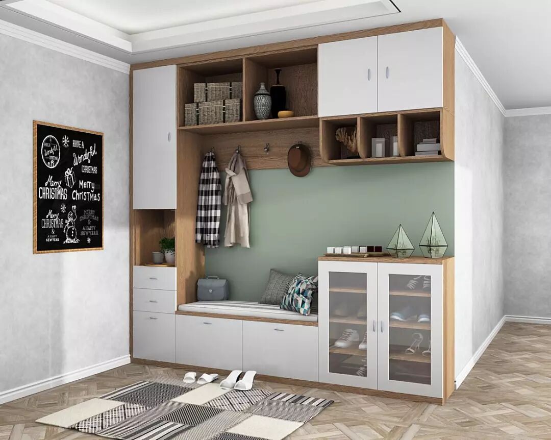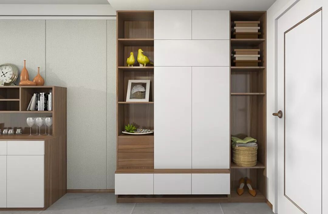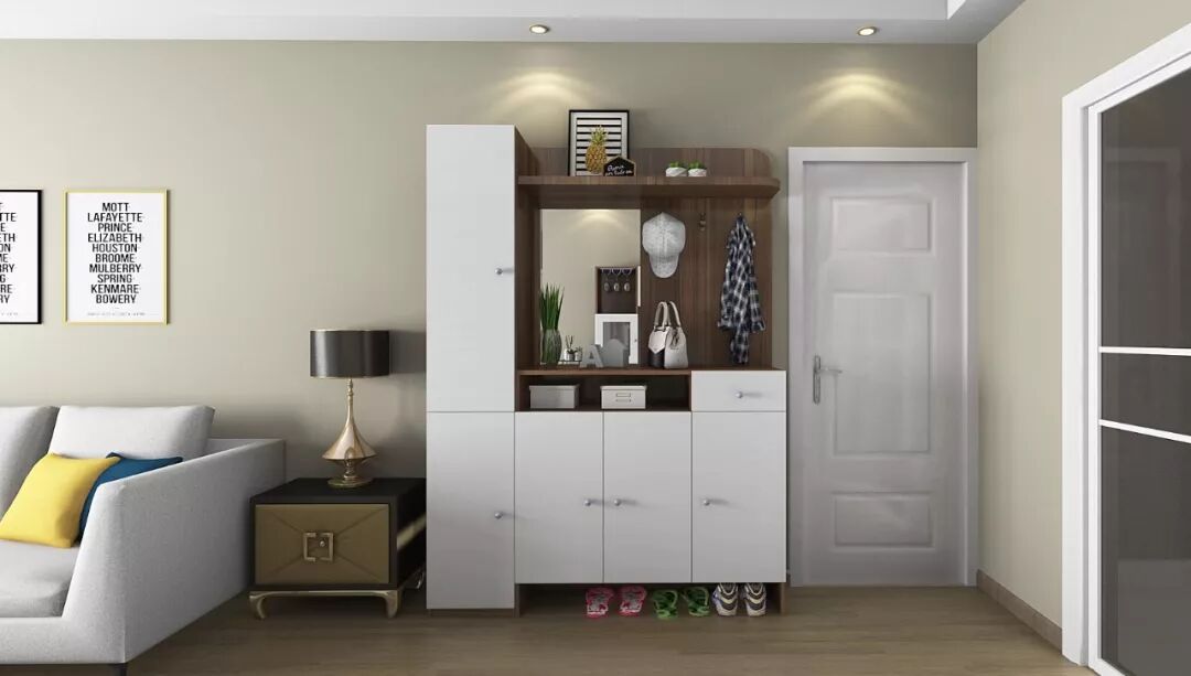 一个组合入户柜,功能会更完整,包括换鞋凳、常用和不常用的分区鞋柜、展示柜、穿衣镜、衣柜等,麻雀虽小,五脏俱全,既可以保持主人的私密性,又方便脱衣服换鞋挂帽,养成良好的生活习惯。